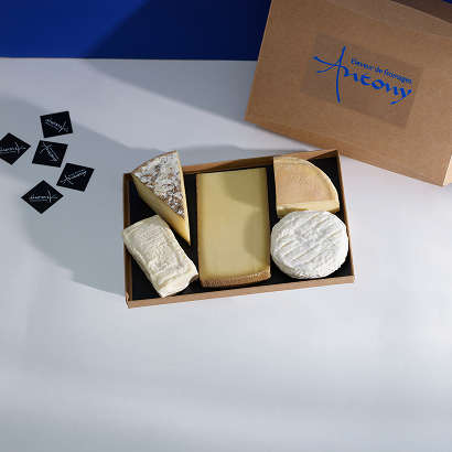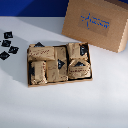 Nos fromages, livrés dans la boite d’Antony avec leurs fanions, pour reconnaître leur origine en un coup d’œil.
