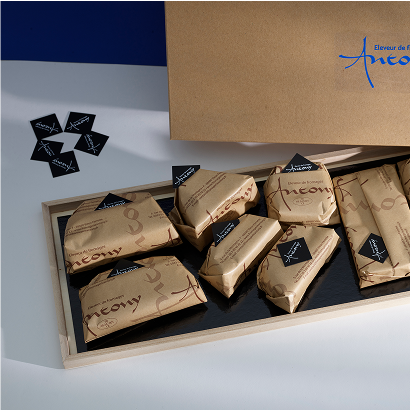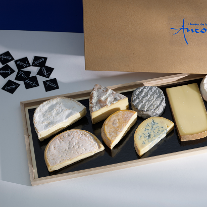 Nos fromages, livrés dans la boite d’Antony avec leurs fanions, pour reconnaître leur origine en un coup d’œil.